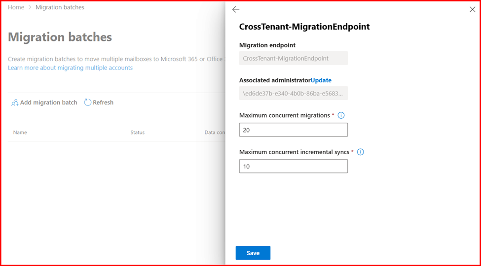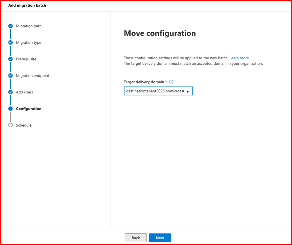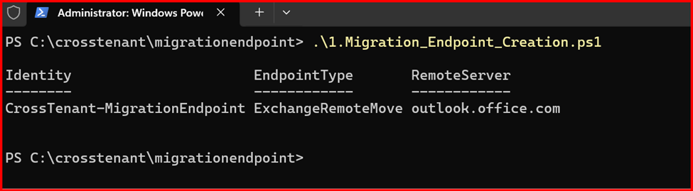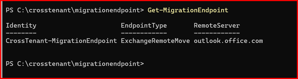 New-MigrationEndpoint -RemoteServer outlook.office.com -RemoteTenant “sourcetenant2025.onmicrosoft.com” -Credentials $Credential -ExchangeRemoteMove:$true -Name “CrossTenant-MigrationEndpoint” -ApplicationId $AppId