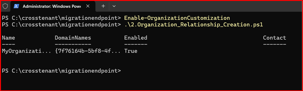 New-OrganizationRelationship “MyOrganizationRelationship” -Enabled:$true -MailboxMoveEnabled:$true -MailboxMoveCapability Inbound -DomainNames $sourceTenantId