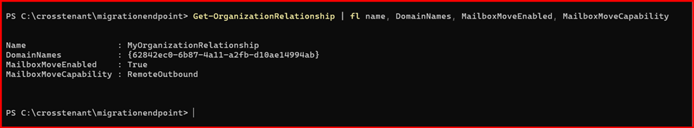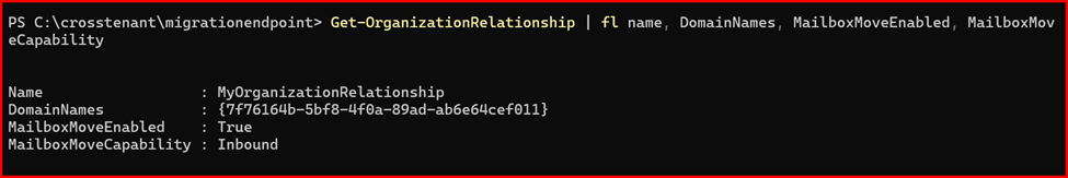 Get-OrganizationRelationship | fl name, DomainNames, MailboxMoveEnabled, MailboxMoveCapability