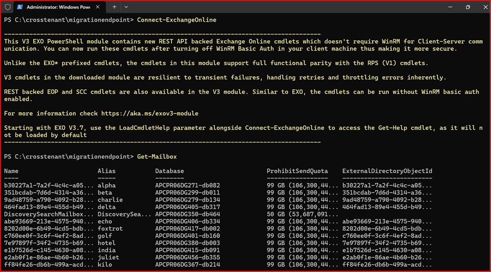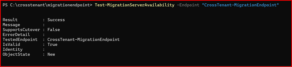 Test-MigrationServerAvailability -Endpoint “CrossTenant-MigrationEndpoint”
