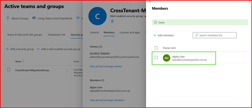 This Group is created in Source Tenant so add member from Source Tenant Admin Portal.