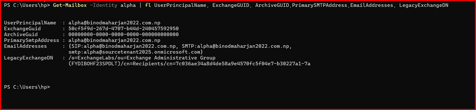 Get-Mailbox -Identity alpha | fl UserPrincipalName, ExchangeGUID, ArchiveGUID,PrimarySMTPAddress,EmailAddresses, LegacyExchangeDN