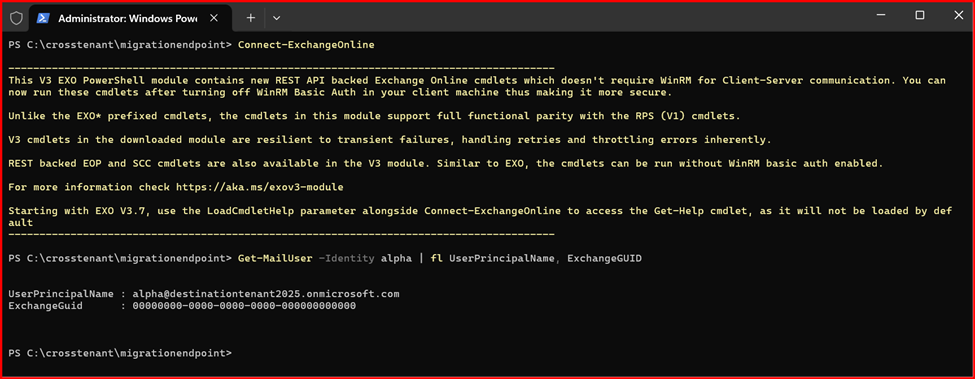 Get-MailUser -Identity alpha | fl UserPrincipalName, ExchangeGUID