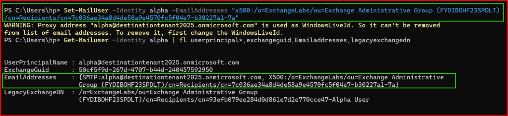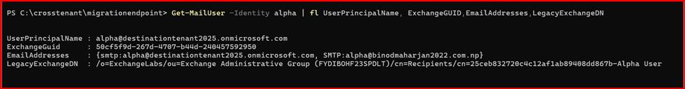 Get-MailUser -Identity alpha | fl UserPrincipalName, ExchangeGUID,EmailAddresses,LegacyExchangeDN