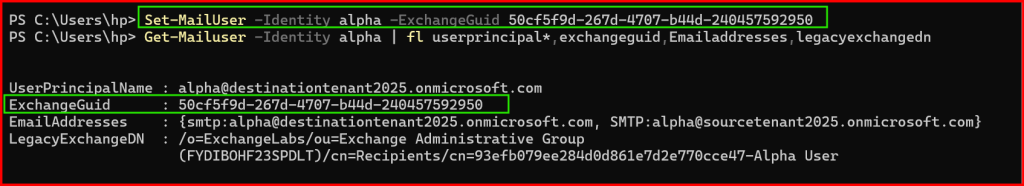 Set-MailUser -Identity alpha -ExchangeGuid 50cf5f9d-267d-4707-b44d-240457592950
